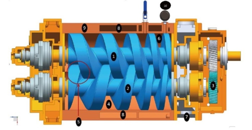 干式螺桿真空泵的工作過程可分為吸氣、壓縮和排氣三個過程。如圖所示,干式螺桿真空泵內裝有一對平行的螺旋狀的轉子(1和2),其中一件轉子的旋轉方向為右旋,另一件為左旋。兩個轉子在泵體(9)內通過一對齒輪(3)保持同步反向旋轉。轉子與轉子之間、轉子與泵體之間沒有磨擦且保持一定的間隙,兩個轉子與泵體之間形成了密封腔(4),密封腔的個數等于轉子的螺旋圈數。兩個轉子在按圖中方向旋轉時,與吸氣口(5)相連的密封腔的空間逐漸變大,氣體被吸入并被傳送到排氣側,排氣側的密封腔(6)空間在旋轉過程中逐漸變小,氣體被壓縮到排氣口(7)。長時間運轉時需向泵體及端蓋的夾套(8)內通入適量的冷卻水以對泵進行冷卻。因壓縮熱主要在排氣側(6)產生,為了充分冷卻轉子,在多數工況下可以將適量的空氣或其它合適的氣體通過摻氣口(10)導入泵腔內。